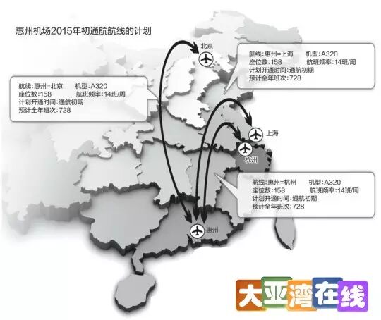 方案中的惠州机场2015年初通航航线计划显示,惠州先期将开通惠州至北京、上海、杭州三地的航线,均采用158座的空客A 320机型。在通航初期,3条航线均计划每周开航14班,预计全年每条航线都将发728个班次。