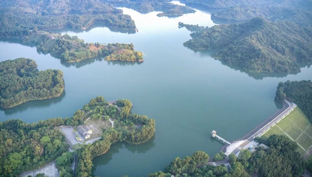 从空中俯视惠州,青山碧水、绿荫掩映,滨江公园,东江公园,东江沙公园,红花湖,丰渚园,市民乐园、金山湖公园等一大批高品质城市公园错落其间,公园隐于绿丛,浮于水际。